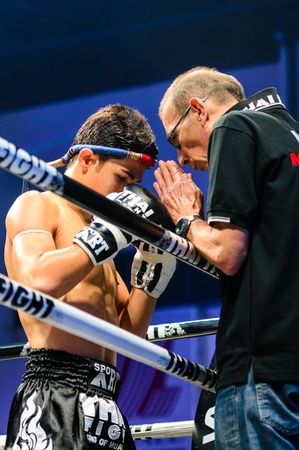 BANGKOK - JUNE 29 Coach Praying before the match for Leo Pinto of France in Thai Fight Extreme 2013 on June 29, 2013 at MCC Hall, The Mall, Bangkapi, Bangkok, Thailand