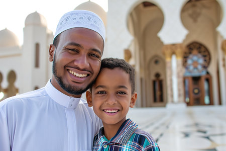 Generative AI Image of Back View African Father and Son in Islamic Mosque with Cityscape