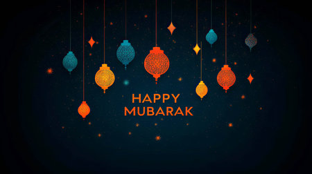 Colorful lanterns hanging against a dark background with the text Happy Mubarak