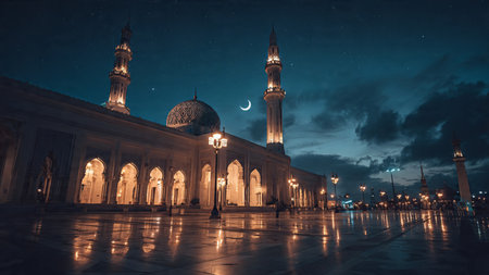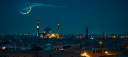Stunning mosque stands tall against a vibrant sunset, with crescent moon above and cityscape in the background, highlighting architectural elegance and cultural richness