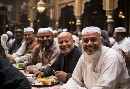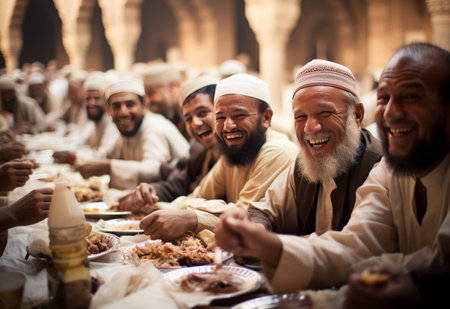 Group of Muslim people wearing traditional clothes at the celebration of Ramadan Kareem.