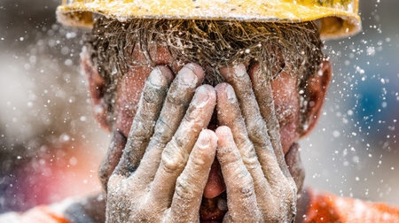 A construction worker, visibly exhausted and covered in dust, holds his face in his hands, showcasing the physical and emotional toll of labor.