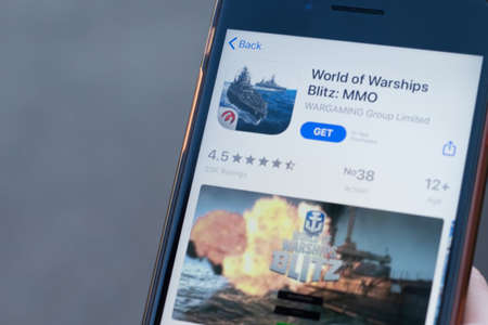 New York, USA - 1 May 2020: World of Warships Blitz app logo close-up on phone screen, Illustrative Editorial.