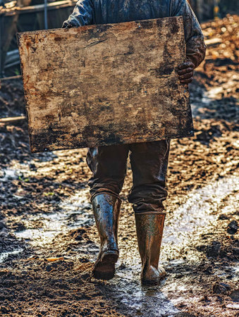 photo of a farmer holding a mockup sign with muddy hands, standing in a freshly plowed field, late afternoon sun --chaos 12 --ar 3:4 --weird 150 --v 6.1 Job ID: c7b5ccd1-da8b-44c0-8a3e-09046c765931
