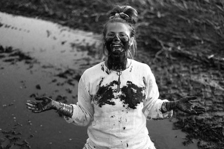 Dirty female model. Woman in clay mask laughs. Crazy girl in medical mud. Spa Outdoor. Happy dirty woman in Dead sea. Young woman enjoy natural mineral mud sourced from Dead sea.
