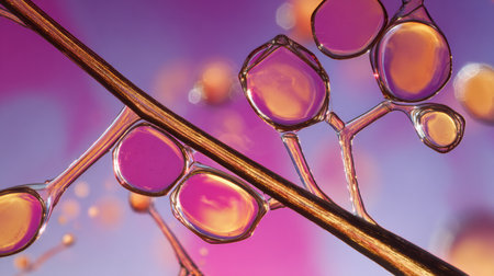 Translucent bubbles cluster around a branch, illuminated against a vibrant purple backdrop, showing intricate structures and captivating light reflections.