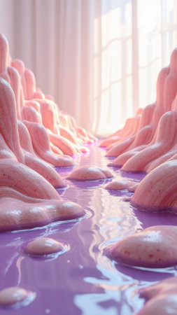 Surreal pink and purple organic forms in a sunlit room. That the image is generated using AI.