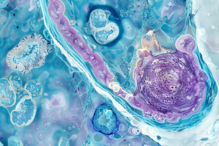 A colorful image of a cell with a purple and blue blob in the center. The image is abstract and has a mood of curiosity and wonder