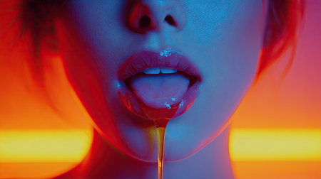A close-up captures a person's face, focusing on the open mouth and tongue with a liquid dripping downward. The image features vibrant colors, with red and blue tones predominating, creating a striking contrast. The composition highlights details, suitable for various uses including advertising and artistic concepts.