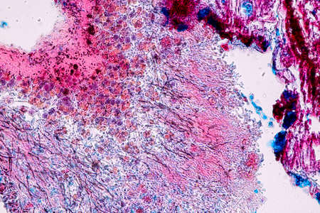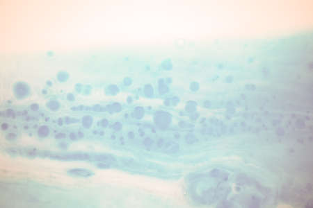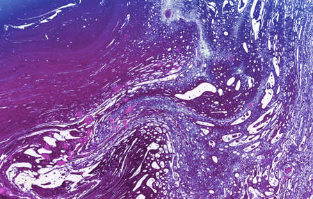 Ovarian cancer, light micrograph, photo under microscope. Photograph shows a fragment of a cancerous tumor in the female ovary. Selective focus