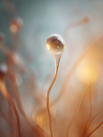 A tiny glistening sphere clings to a thin, arching plant thread, illuminated by gentle sunlight, creating a serene and dreamy natural scene with blurred surroundings