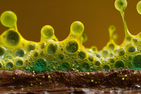 Macro shot of a chocolate cake with bubbles on a yellow background