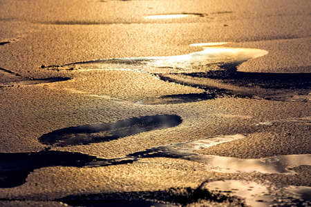 Melted snow on road. Melted mud. Asphalt details in winter. highway without cars.