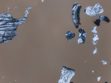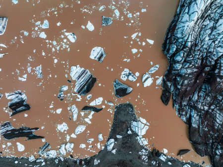Aerial view of floating icebergs as a result of global warming in Fjallsarlon glacier lake in Iceland by drone