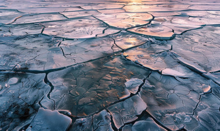 Cracked ice surface reflecting winter sunlight in a frozen lake during mid-afternoon, showcasing intricate patterns and textures