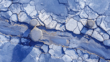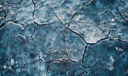 Explore this stunning aerial view showcasing a frozen landscape with intricate cracks and blue hues, emphasizing the beauty of winter's elegance.