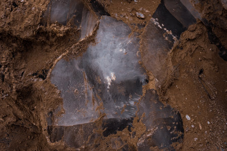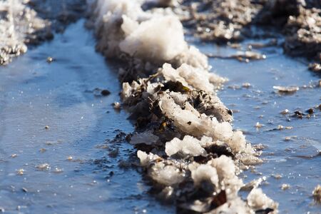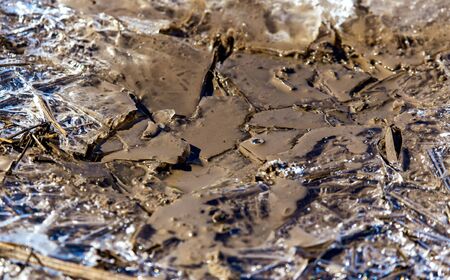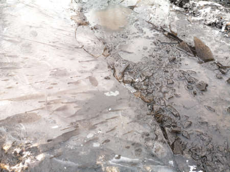 Melting crushed ice on dirt road. Details shot. Abstract background of melted spring ice close up.
