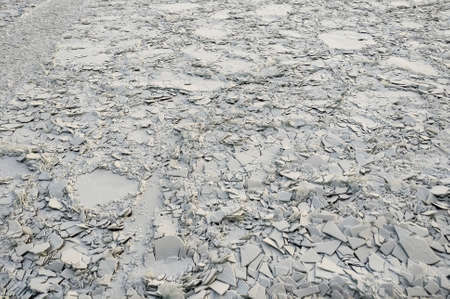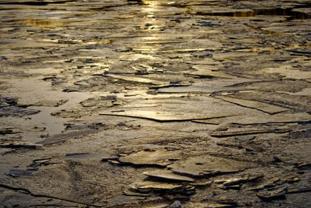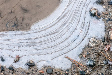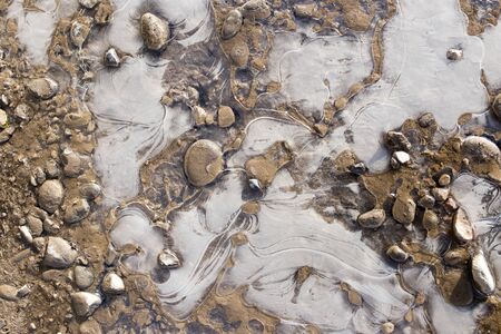 Frozen water, mud and stones, winter view