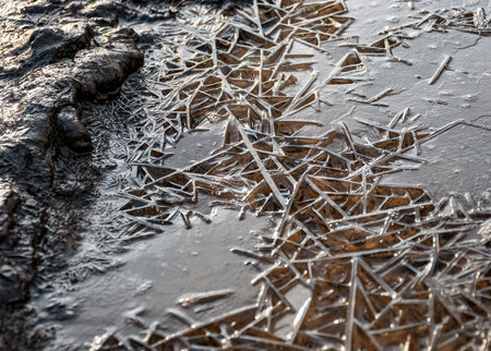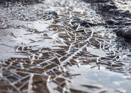 Ice and snow in puddles in spring or autumn time. Thaw after winter in nature