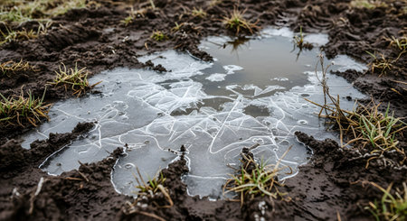 A close-up of a frozen puddle in muddy ground, showing intricate patterns and cracks on the surface of the ice. Blades of grass poke through the dark, damp soil around the puddle. The image captures a cold, wintry, and natural texture.