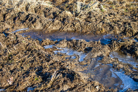 Frozen Ground Surface with Ice Patches in Rural Agricultural Field