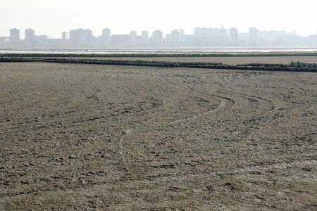 Thick, dark mud is present on the ground at a coastal wetland exposed during low tide, with moisture glistening under the sun.