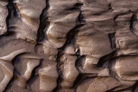 Wavelets formed on the sand and silty-clay shore. Pattern. Brown and gold colors. Sand patterns on the beach at low tide.