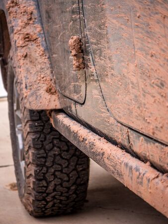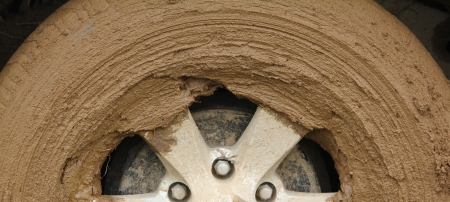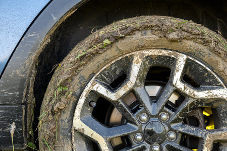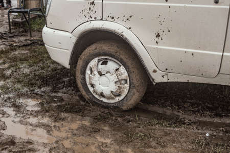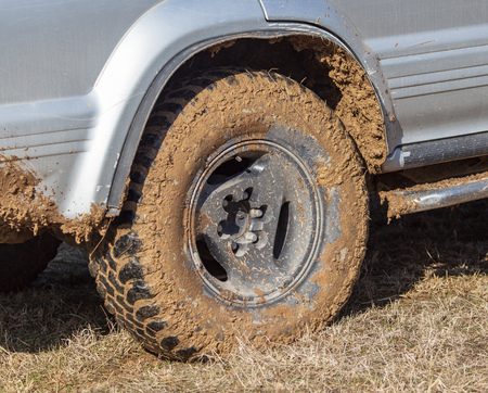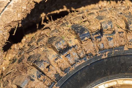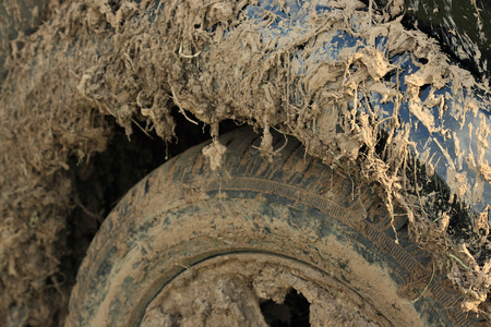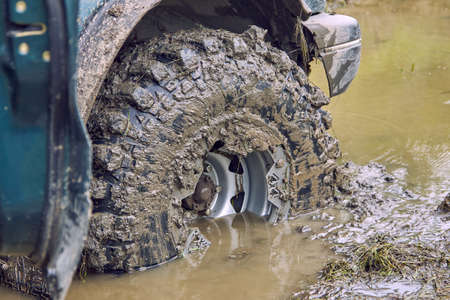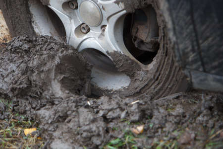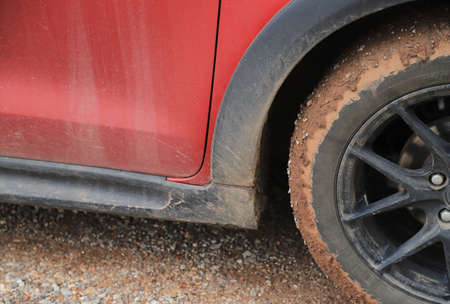 Close-up car tires are dirty on the mud. During the rainy season outdoor adventure and travel.