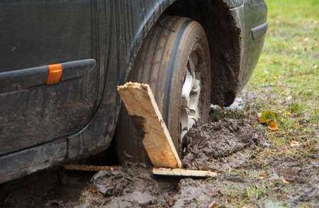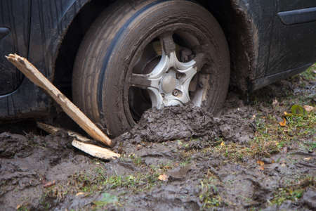 The car got stuck in wet mud. Close-up of a car wheel in the mud. Off-road after rain
