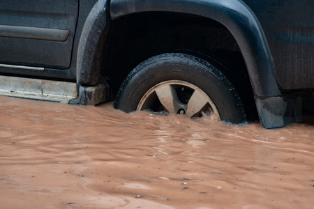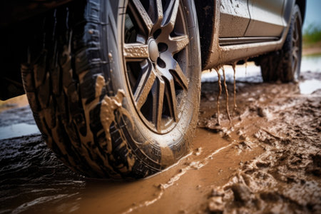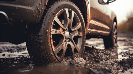 Close up of a muddy car tire on a wet and muddy road, highlighting the challenging driving conditions