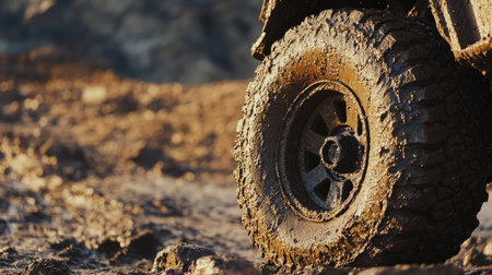 This image showcases a close-up view of a muddy off-road tire, highlighting the detailed tread patterns and dirt texture against a rugged background.