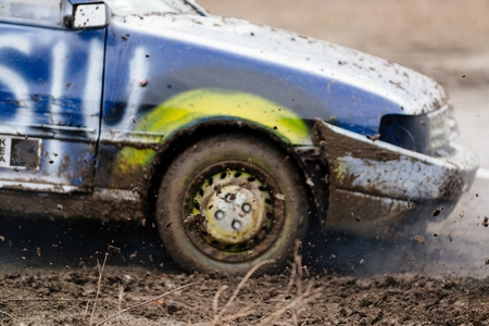 Wreck scrap cars dirt race. Selective focus on splashing mud