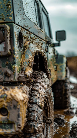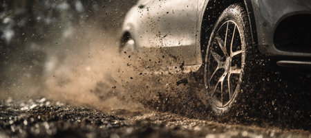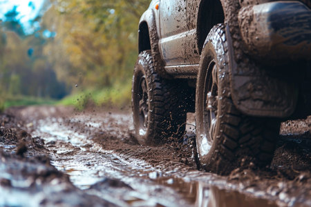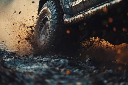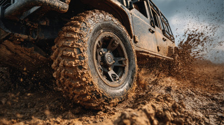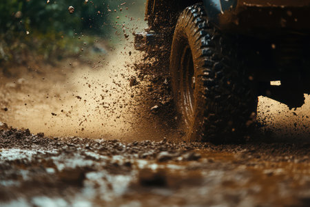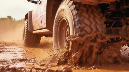 Wheels of an off-road vehicle kick up mud and dirt while navigating through challenging terrain. The scene captures the thrill of adventure in an outdoor setting.