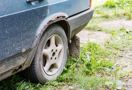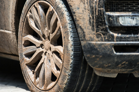 dirty mud stain on wheel and car surface from long using in rainy season for cleaning dirt stain concept
