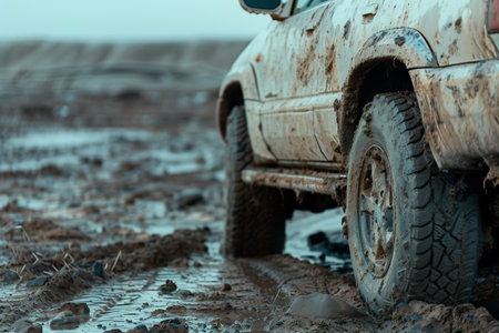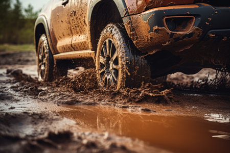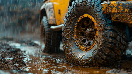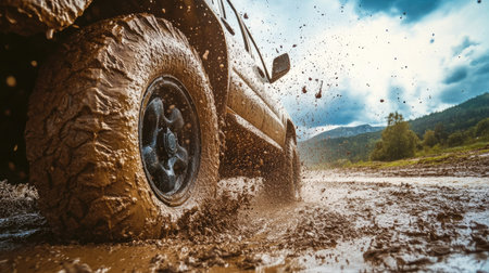 Close up of muddy tire on off road vehicle splashing through puddle on rainy day, embodying adventure and freedom in nature. Shows power and versatility in extreme weather