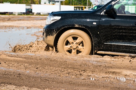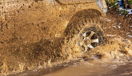 Extreme off-road vehicle driving on muddy road with mud splashes