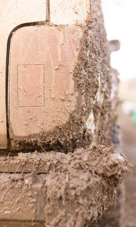 Close up of dirty off road car wheels with dirty tires covered with yellow mud.