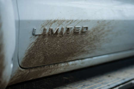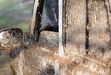 White door of a pickup truck covered in dirt. Off-road driving in an SUV