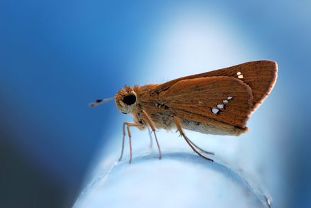 Macro of profile skipper butterfly on blue flower