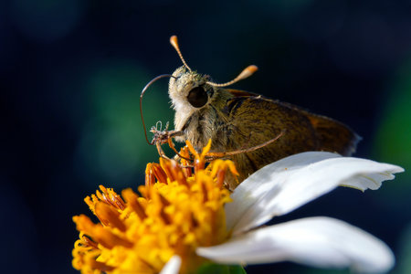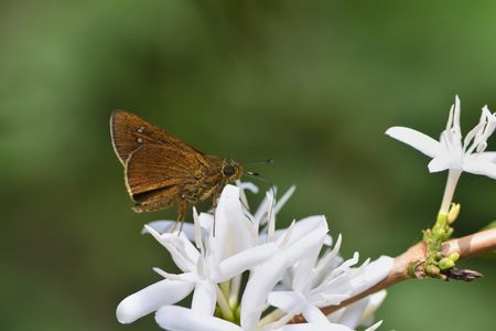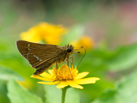 A common straight swift butterfly, Parnara guttata, feed on nectar from flowers in a Japanese flower garden.
