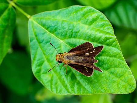 Oriental skipper (Muschampia orientalis, Hesperiidae), the fatheaded butterfly sits on a green leaf