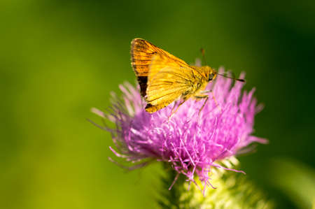 close-up of a butterfly of the genus Brown Skipper (Thymelicus indet) on a lilac colored thistle flower
