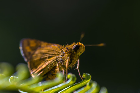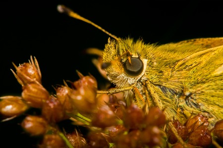 Portrait of butterfly Hesperia Comma which sits on a dry flower