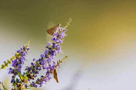 ochlodes sylvania butterfly on a lilac flower with green background. macro nature photography. insects and plants. copy space