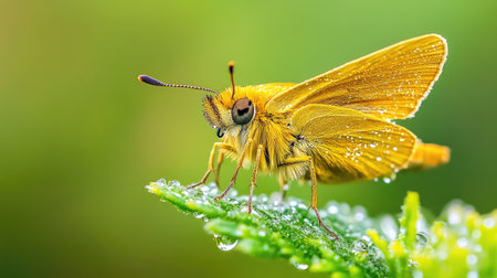Macro shot of a Golden Skipper drenched in soft rain, tiny droplets shimmer on its wings and antennae