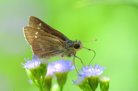skipper resting on blue flower