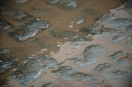 Close-up view of textured wet soil showcasing muddy water puddles and scattered stones, ideal for illustrating natural landscapes and earth sciences.