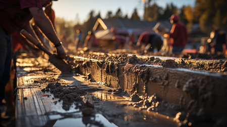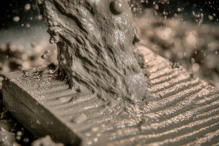 Close-up view of fresh concrete being extruded highlighting its rich texture as it flows from the nozzle onto the surface illustrating construction activity.