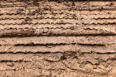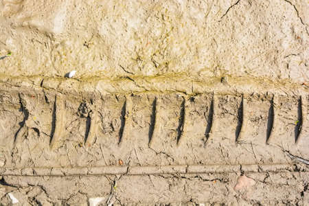 Footprint or imprint shoe in the mud.Mud texture or wet brown soil as natural organic clay and geological sediment mixture as in roughing it in a dirty muddy country ground after the rain or rainy.