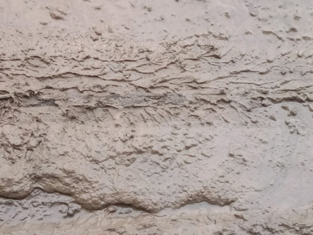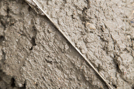 A close-up, detailed photograph of wet, grey mud that is beginning to dry and crack. A small channel or groove winds through the textured surface, highlighting the natural patterns created by the drying process.